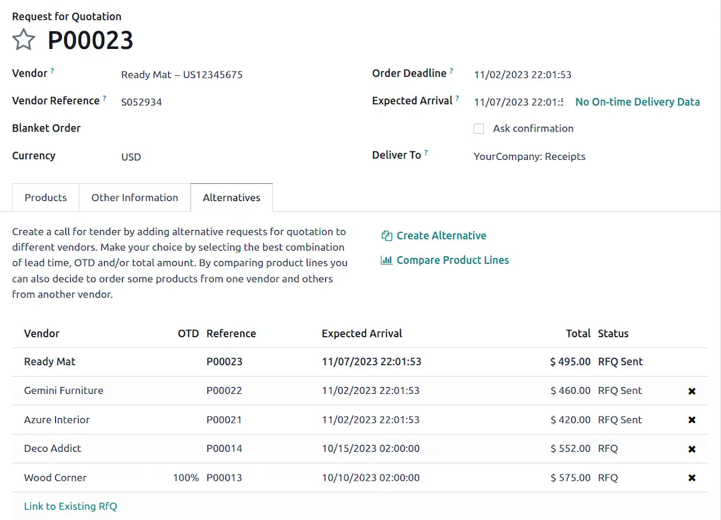 فرآیند تأمین کالا را ساده کنید و از تمام شدن موجودی جلوگیری کنید. از درخواست قیمت (RFQ) گرفته تا دریافت کالا، از تنوع محصولات تا صورتحساب فروشندهها — نرمافزار جامع خرید Odoo همه چیز را بدون دردسر مدیریت میکند.